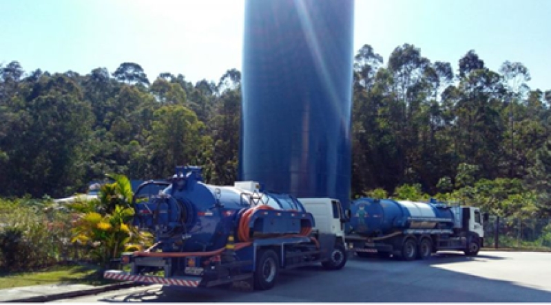 Frota própria, o caminhão combinado tem sua carroceria dividida em armazenagem de água contaminada e de água limpa para hidrojateamento.